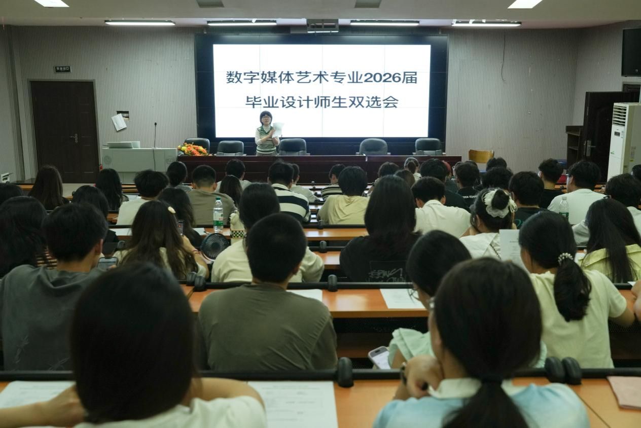 为推动毕业设计教学工作的有序开展,进一步优化师生资源配置,6月18日,数字媒体艺术专业在学院报告厅举行2026届毕业设计师生双选会。活动由专业教研室主任梁可嘉主持,数字媒体艺术专业全体教师与2022级全体学生共同参与。