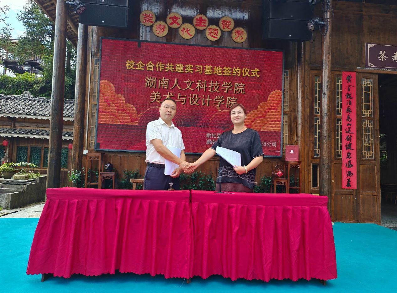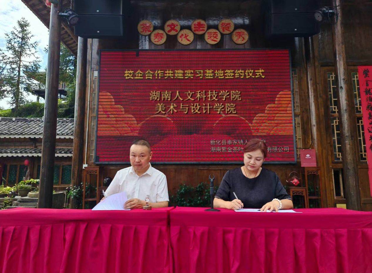8月21日上午,美术与设计学院副院长童玲代表学院与湖南紫金茶叶科技发展有限公司在新化渠江源紫金山庄签订了校企共建实践教学基地协议,并举行了挂牌仪式。同时签约并挂牌的单位还有长沙理工大学建筑学院。