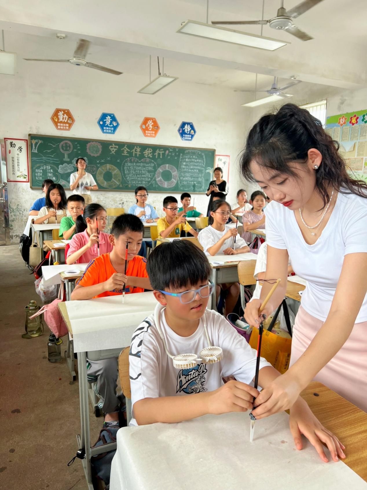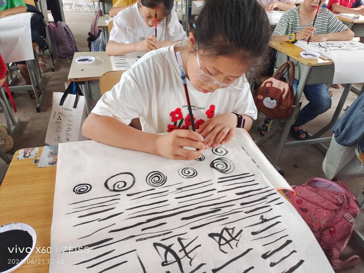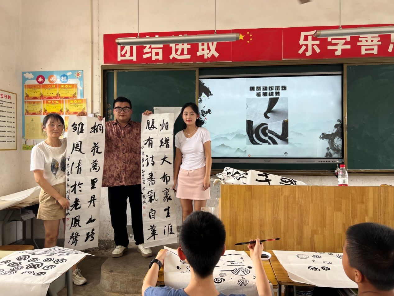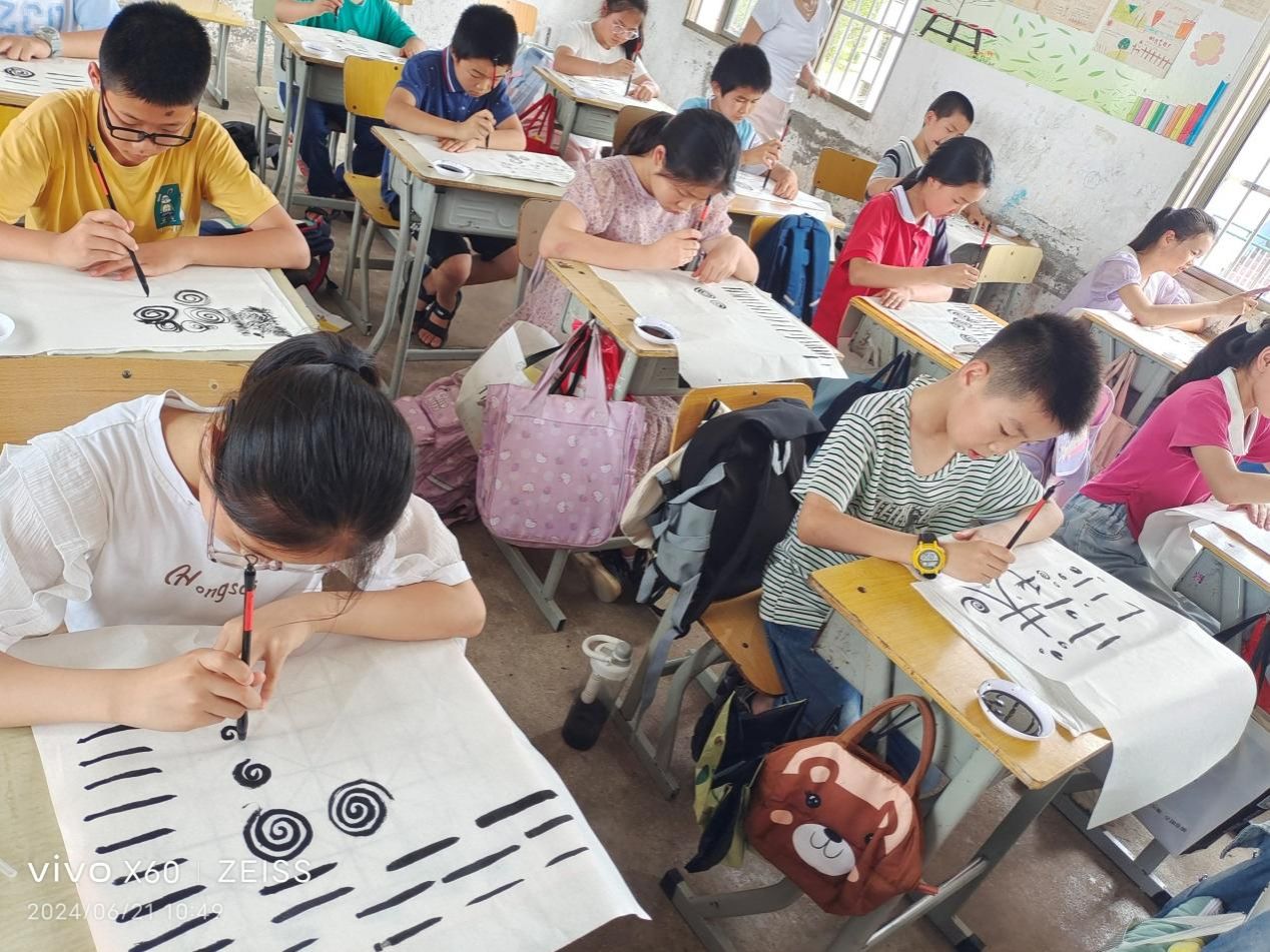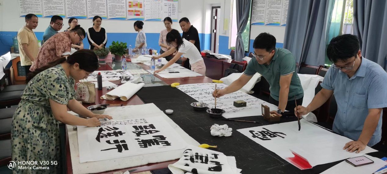 上午9:30——10:30,第二教工党支部党员教师和书法学专业学生到虞唐镇中学会议室为该校和虞唐镇学区书写党纪学习教育有关书法作品。接着,应虞唐镇学区和虞唐镇中学请求,教师党员为他们的各个办公室书写书法作品,并进行书法作品上墙装潢设计。2022级书法学专业学生邓亚辉则应邀到虞唐镇小学为五年级学生上书法课,邓亚辉同学趣味盎然的教学使整个教学过程高潮迭起。郭刚同学负责拍照和书写书法作品送给互动中最为突出的学生。一节课结束,学生意犹未尽,邓亚辉和郭刚同学应班主任要求,将课延长了30分钟。午饭之后,第二教工党支部党员教师和书法学专业学生继续为虞唐镇小学书写党纪学习教育书法作品,并创作了总计二十多幅书法作品赠送给该学区的领导和老师们。