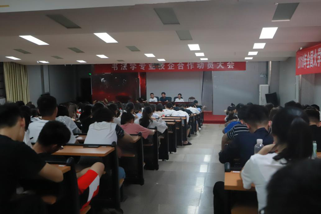 6月19日晚,书法学专业在逸夫楼一楼报告厅召开2018年校企合作动员大会。会议由书法学教研室主任蒋全顺老师主持,各班校企合作指导教师以及学院党政领导谢光绎、易俊、陆序彦出席大会。