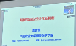 来自中国农科院的国家优青基金获得者(2020年)、中国青年科技奖获得者(2022年)、博士生导师郭兆刚研究员为论坛做了题为“小菜蛾对Bt杀虫蛋白产生抗性的分子机制”的主旨报告报告从小菜蛾对Bt Cry1Ac毒素的抗性起源、传统靶标受体抗性等切入,系统讲解了过去20多年小菜蛾对Bt Cry1Ac抗性的研究进展,并结合自身10余年的研究经验以及近期的研究成果,揭示了小菜蛾不同中肠受体间的功能冗余性和分子互补作用模式,系统阐述了昆虫激素水平升高与串扰可以激活MAPK信号途径负调控多个中肠受体基因差异表达,从而导致了小菜蛾对Bt Cry1Ac的高抗性,为深入理解昆虫Bt抗性治理提供了重要的理论基础。之后,中国农业大学植物保护学院博士生导师夏吉星教授做了题为“烟粉虱适应性进化新机制”的主旨报告,报告阐述了烟粉虱通过水平基因转移的方式“劫持”了植物中酚苷丙二酰转移酶基因BtPMaT1用以代谢植物毒素,从而形成烟粉虱广泛寄主适应性的分子机制。为我们揭示了昆虫如何利用水平转移基因来克服宿主的防御机制,为探索昆虫适应性进化规律开辟了新的视角,也为新一代靶标基因导向的烟粉虱田间精准绿色防控技术研发提供全新思路。来自湖南大学的彭琼博士湖南省农科院的李祖任博士以及贝博郭开发博士、郑慧新博士王双辉博士分别作了题为野燕麦中除草剂代谢抗性基因的挖掘、植物源羊脂酸的抑草靶标活性挖掘与利用、抗黄精根腐病生防菌的筛选和菌肥研制、烟粉虱田间危害现状研究、EGCG通过调控内质网应激降低镉致秀丽线虫的发育毒性的学术报告参与师生对学术报告进行了提问交流。