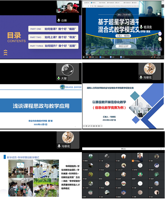 为进一步促进教师有效开展教学,提升课堂教学效果,提高人才培养质量,127日下午,农生院在腾讯会议平台开展提升教师教学能力集中培训活动,学院全体专任教师参加。本次培训交流活动,邀请到白婧、杨泽良、曾智、马银花四位博士为大家做教学辅导讲座,他们主讲的题目分别是如何上好一门课?基于超星学习通平台的混合式教学模式探索与实践、浅谈课程思政及教学应用、以赛促教开展信息化教学(以信息化教学竞赛为例)。