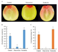 图(2):The effects of nano-silver (aquaporin inhibitor) and forskolin (aquaporin promoter) on the absorption of acid fuchsin (A) and water (B), along with the fruit-cracking percentage (C) in ‘Xiangfei’ berries
