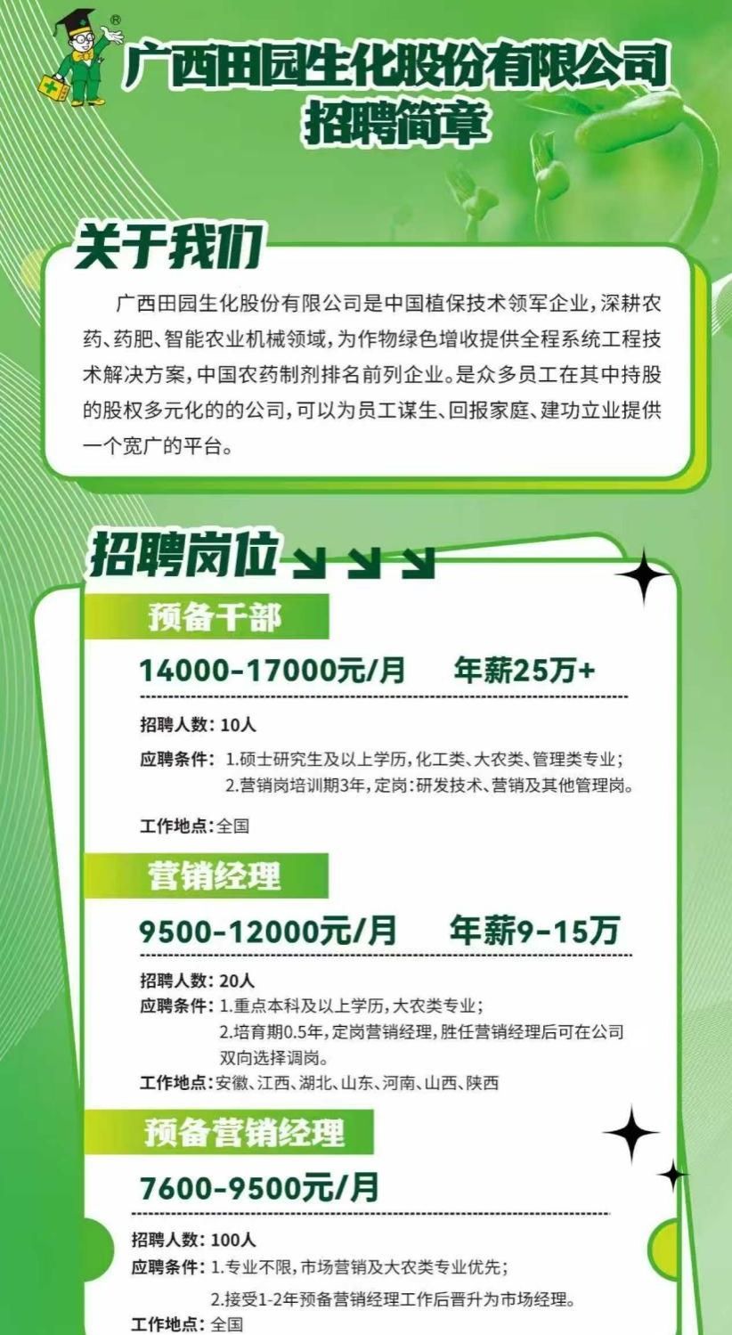 广西田园生化股份有限公司是中国植保技术领军企业,深耕农药、药肥、智能农业机械领域,为作物绿色增收提供全程系统工程技术解决方案,中国农药制剂排名前列企业。是众多员工在其中持股的股权多元化的的公司。