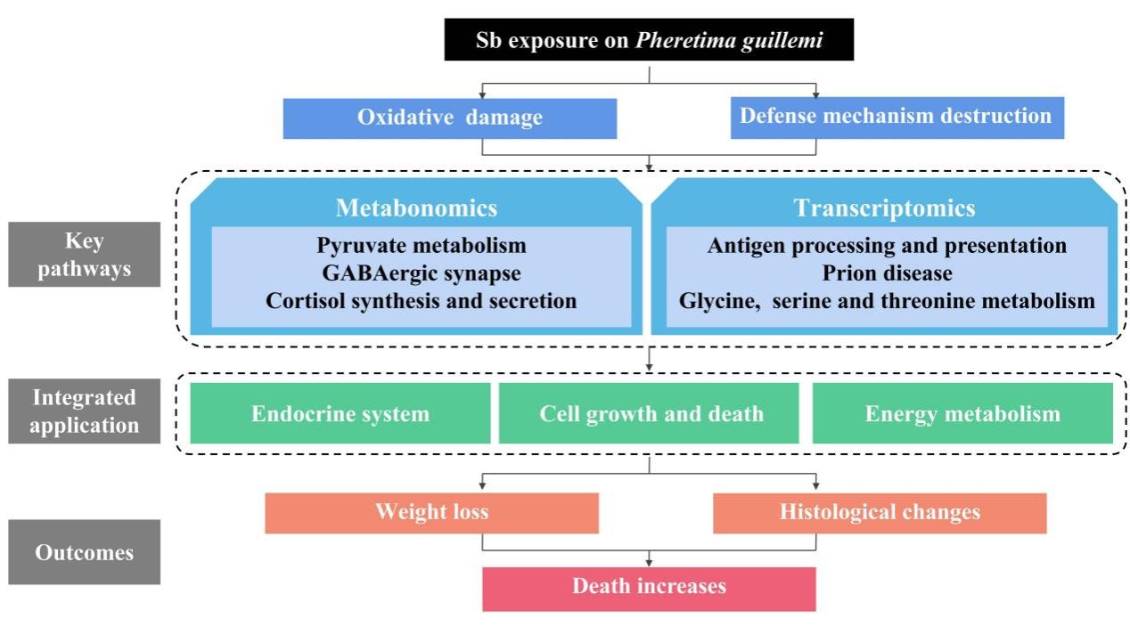 我国锑储量和开发量位居全球之首。然而,锑的开采与冶炼过程中,大量锑元素释放至土壤和水体,导致严重污染。蚯蚓作为重金属等污染物的敏感指示生物,广泛应用于生态毒性测试。锑可引发蚯蚓回避反应、生长抑制、肠道组织损伤及氧化应激。然而,蚯蚓对锑污染的解毒机制与适应性机制尚不明确。
