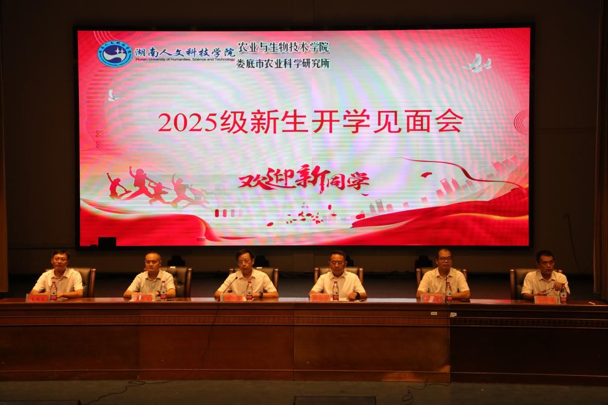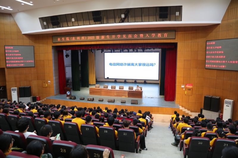 9月16日19:30,农业与生物技术学院(娄底市农业科学研究所)2025级新生开学见面会暨入学安全教育在学校逸夫楼音乐厅举行。会议由学院党总支书记邹坤主持,院(所)长向国红,副书记王东光,副院长刘泽发、孟桂元,副院(所)长朱赞江,党总支委员,教研室、研究室、实验室、教务办、学工办、办公室、科技办、基地办、实训中心等负责人,全体辅导员,教师代表,新生班主任及助理班主任,全体新生同学参加见面会暨入学教育。