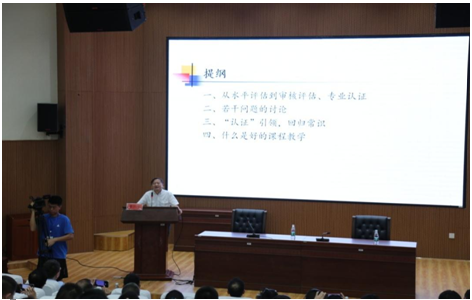湖南大学谭阳红教授做了《工程教育专业认证及其底线》的讲座。她从工程教育专业认证的概念、现状、流程及工程教育专业认证的底线做了详细介绍,以《电磁场与波》这门课为例讲述了如何贯穿OBE理念,将抽象、难懂、难学的课程变得形象生动有趣,使学生在游戏中学,在做中学,将“思政元素”融入到整个课堂中,老师们受益匪浅。