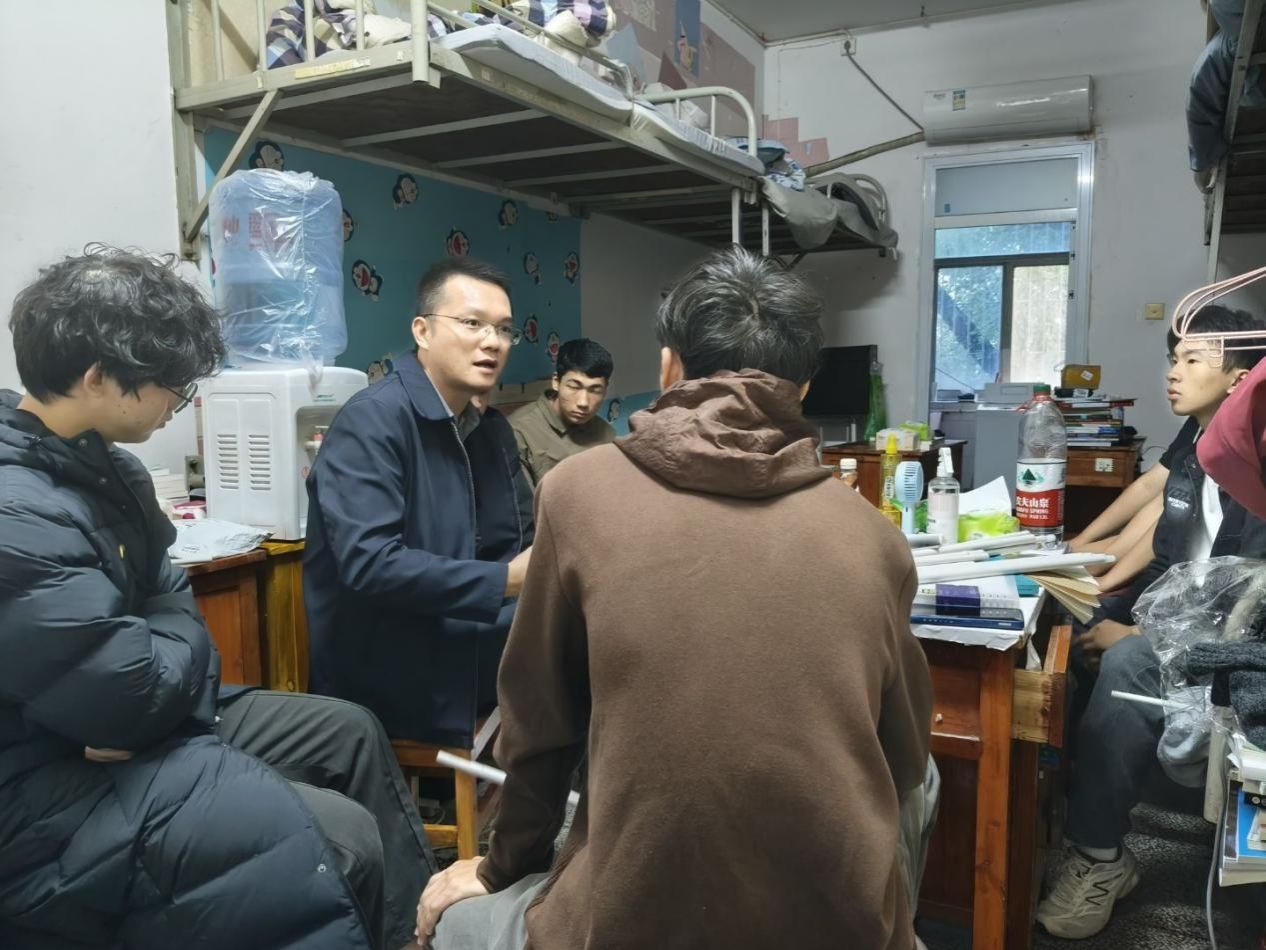 校领导与党员教师逐间走进学生宿舍,与学生面对面交流,详细了解大家的学习生活情况,重点关注学习状态、生活条件、心理健康及校园服务需求等方面。交流过程中,对于学生提出的学业规划困惑、就业准备难题、宿舍生活疑问等,胡书记与党员教师耐心倾听,结合实际情况现场给予针对性建议;针对宿舍设施损坏、网络环境不佳等问题,工作人员逐一记录相关情况,并承诺将尽快协调相关部门推进解决。同时,校领导与党员教师还向学生强调宿舍安全规范,反复提醒大家注意用电安全、做好防火防盗措施,倡导共同保持宿舍整洁有序的居住环境。