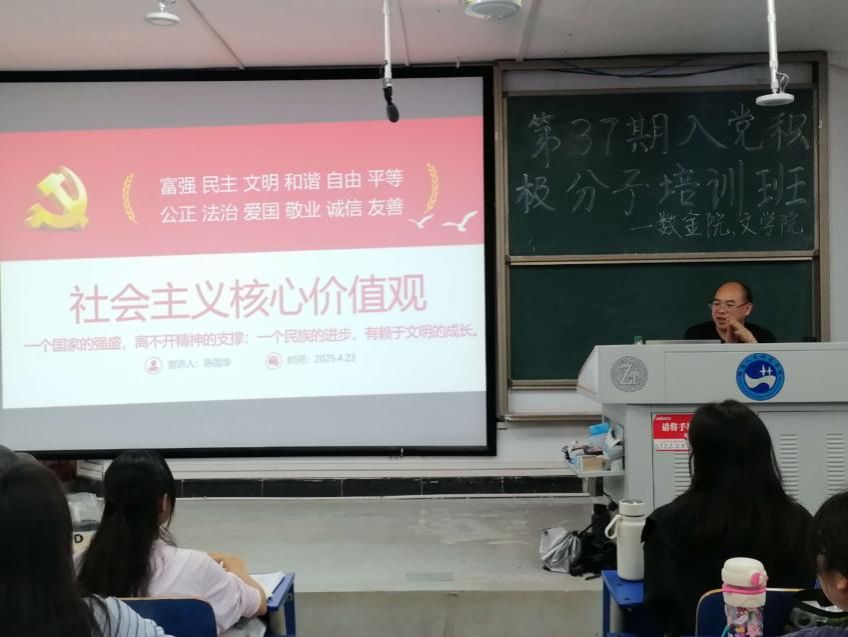 为不断提升入党积极分子的思想政治素养,4月23日晚,数学与金融学院联合文学院在致远楼520教室开展第37期入党积极分子培训。本次党课主题为“社会主义核心价值观”,由数学与金融学院党总支书记陈国华主讲,全体第37期入党积极分子参加。