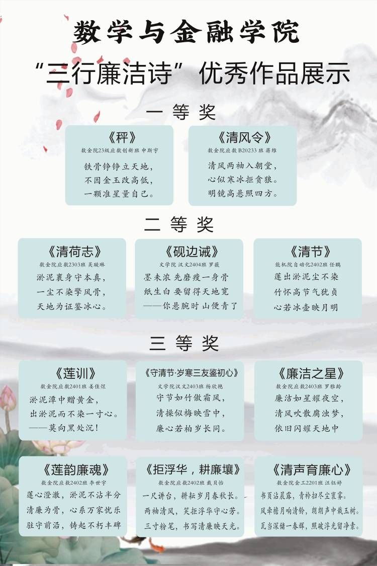 为推进学院清廉建设工作,结合学校第三届数学文化节,数学与金融学院面向全体在校学生开展了“诗承廉洁·行守清风”三行廉洁诗大赛。活动自5 月 10 日启动,至 5 月 20 日圆满结束,吸引了众多同学踊跃参与,经过激烈角逐,最终评选出了一、二、三等奖。