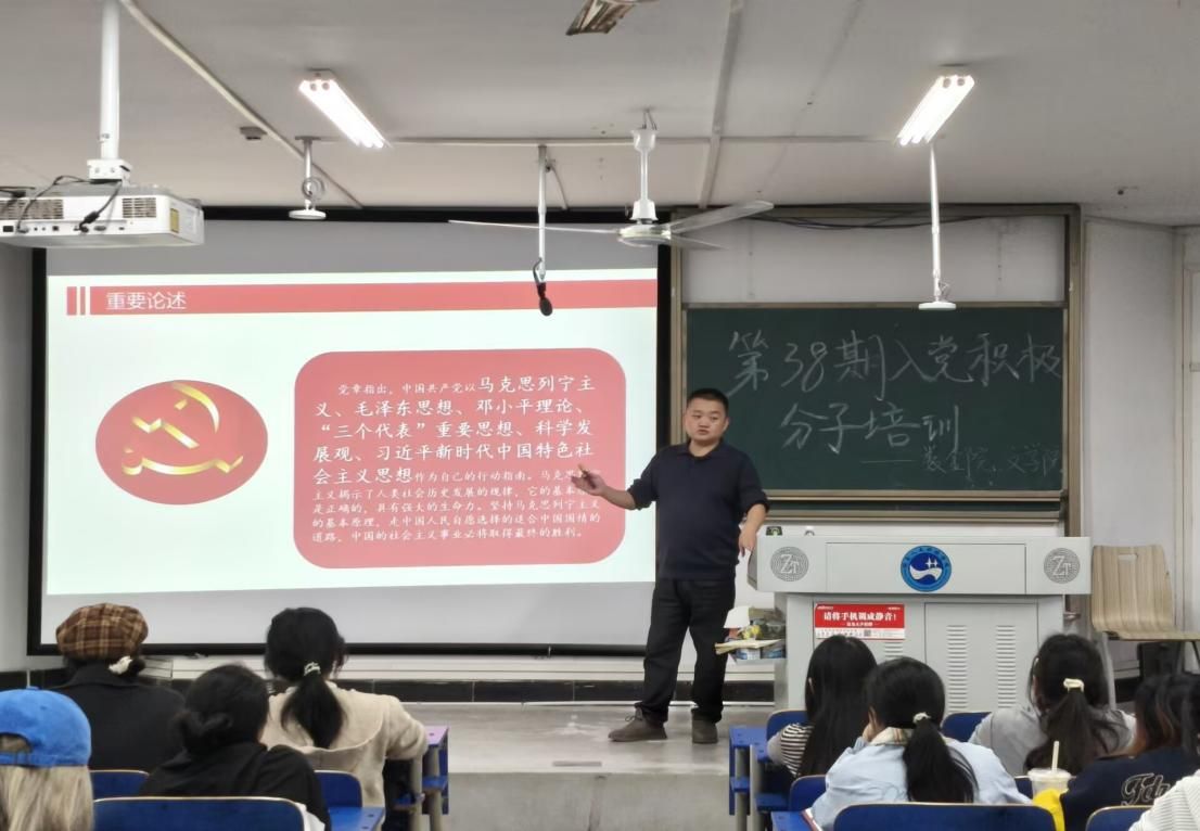 为深入学习贯彻党的创新理论,帮助入党积极分子系统把握党的指导思想核心要义,筑牢理想信念之基,明晰党的理论发展脉络,10月29日,数学与金融学院联合文学院于致远楼520教室成功举办第38期入党积极分子第二次专题培训。本次培训以“党的指导思想、基本理论”为主题,由数学与金融学院学生第一党支部书记牛津老师主讲,两院全体入党积极分子全程参与、潜心研学。