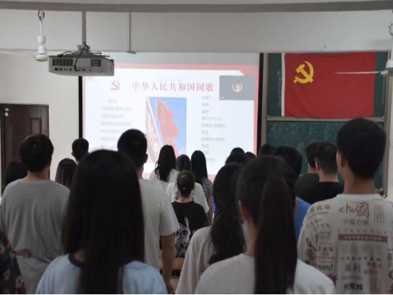 仪式在庄严的《国际歌》中拉开帷幕,12名新加入中国共产党的预备党员在刘珊君的带领下,举起右手庄严宣誓,表达自愿加入中国共产党、为共产主义奋斗终生的决心、随时准备为党和人民牺牲一切的真诚之心。随后,刘珊君代表党支部对新入党的同志表示欢迎,并就工作、学习、思想三方面对新学生党员提出要求。