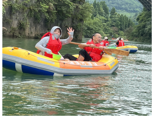 午餐后,大家来到漂流风景区开始了两个半小时的漂流行程。在时而湍急时而平缓的水中,大家抛开平日里的烦恼,或在险滩处来一声尖叫,或纷纷利用水枪或是水瓢玩起了水仗。水枪适合长距离喷射,当敌我有一定距离时,选用水枪,朝对方眼睛攻击,定能将对方打得个措手不及;若敌我距离近,可选用水瓢,舀起水拼命往对方脸上头上泼,然后乘胜漂走……或许我们都拥有一颗未泯的童心,难得放下所有的束缚,拥抱大自然,心中被快乐充满,童性在这一刻释放,此刻的我们仿佛一群调皮的孩童,恣意享受这短暂的快乐,欢乐嬉闹声回荡在高山密林中。