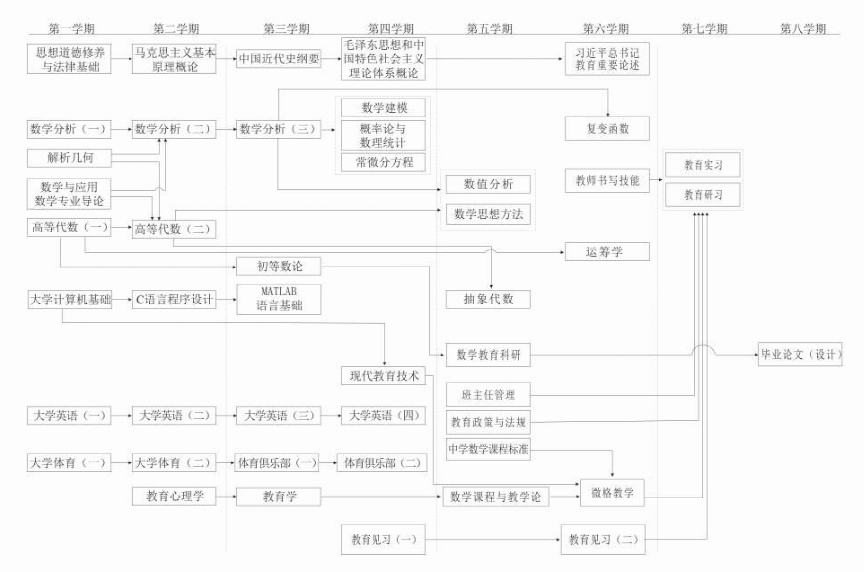 数学分析、高等代数、解析几何、概率论与数理统计、常微分方程、初等数论、Matlab语言基础、数学建模、抽象代数、运筹学、数值分析、数学思想方法、复变函数、教育心理学、教育学、数学课程与教学论、班主任管理等。