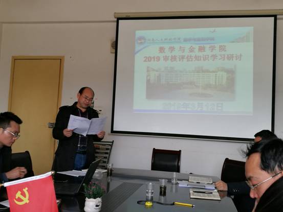 为迎接2019年教育部和省教育厅对贝博的本科教学审核评估工作,认真贯彻“以评促建,以评促改,以评促管,评建结合,重在建设”的工作方针,做好全面启动本科教学审核评估工作的准备,数学与金融学院领导在思想上高度重视,于第3周周二(3月12日)下午的政治学习中启动审核评估知识的学习研讨。