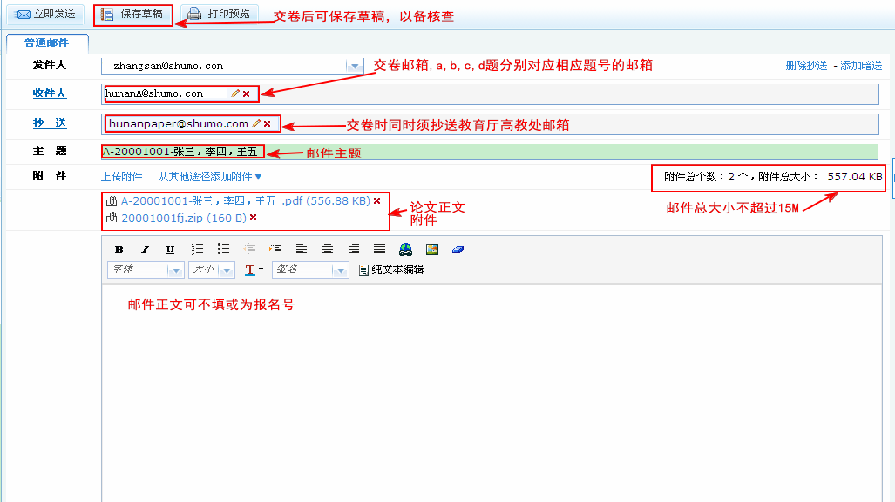竞赛结束后提交论文电子版,不收纸质论文。参赛队于9月12日上午8时前将论文相关材料(正文材料必须为pdf文档(不得压缩),附属证明材料为压缩文档(不含EXE、COM等可执行程序,否则邮箱拒收))按A,B,C,D题分别发送至竞赛收卷邮箱hunanA@shumo.com(A题收卷邮箱), hunanB@shumo.com(B题收卷邮箱), hunanC@shumo.com(C题收卷邮箱), hunanD@shumo.com(D题收卷邮箱),同时所有论文发送时需抄送一份至湖南省教育厅高教处邮箱hunanpaper@shumo.com以备核查。论文发送以参赛队为单位。论文提交时间以邮件接收时间为准。论文详细提交要求和说明如下: