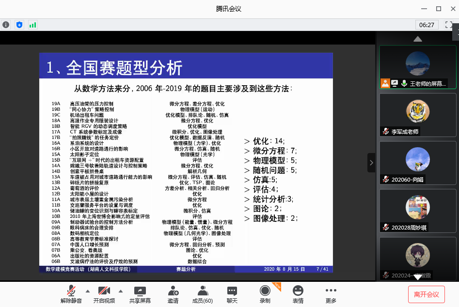 ,数学与金融学院特别邀请国防科技大学王丹博士通过腾讯会议平台为贝博数学建模暑期集训学员在线授课。授课活动分为上午和下午两场,贝博参加数学建模暑期集训的60名学员参加。