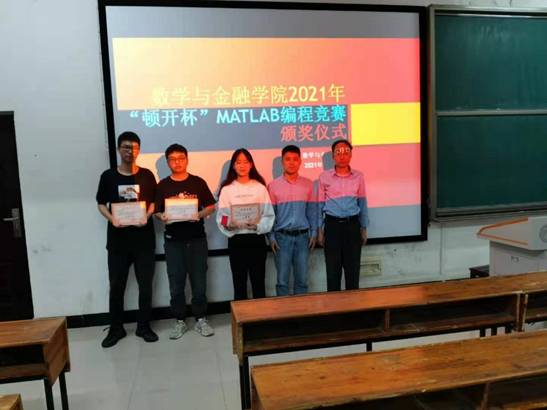 5月17日晚上,数学与金融学院2021年“顿开杯”MATLAB编程竞赛颁奖仪式在学而楼409教室举行。副院长罗志军、信息与计算科学教研室主任杨炼与贝博优秀校友、长沙顿开教育科技有限公司创始人肖艺共同出席了颁奖仪式。颁奖仪式由杨炼主持。