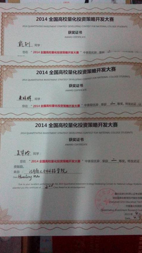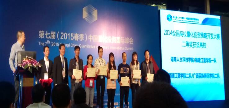 2015年4月19日,由全国高校量化投资策略开发大赛组委会、量化投资分析师认证委员会、中国量化投资研究院主办的2014年全国高校量化投资策略开发大赛颁奖典礼在上海银星皇冠假日酒店隆重举行,贝博由陈伟利老师指导的戴钏、麦琼辉、吴华玲队获得全国二等奖。
