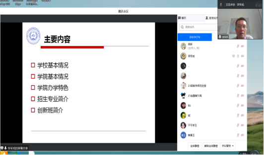 为了帮助2023级新生尽快适应新环境,更好地迎接大学生活,8月13日下午,ballbet贝博bb艾弗森数学与金融学院举行了2023届新生线上答疑交流会。院长李军成、党总支副书记刘晔以及2023届部分新生和新生家长参会,辅导员吴斯主持会议。