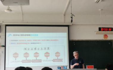 6月21日上午,湖南科技大学数学与计算科学学院副院长彭叶辉到我院在开展研究生招生宣讲,数学与应用数学专业2021级与2022级创新班全体学生参加,副院长龙志文主持。
