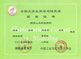 信息与计算科学教研室老师多年来积极指导学生参加各类学科竞赛并取得优异成绩。其中指导学生参加全国大学生数学建模竞赛获全国一等奖2项、全国二等奖3项、省级三等奖以上10多项。指导学生参加“挑战杯”大学生课外学术科技作品竞赛获省级三等奖1项、校一等奖1项、校二等奖2项,校三等奖5项。4次获得校“挑战杯”竞赛优秀指导教师。