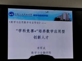 2019日10月25日晚7:30,数学与金融学院李军成副院长为数学与应用数学专业1901班全体学生进行学科竞赛+培养数学应用型创新人才专题介绍。