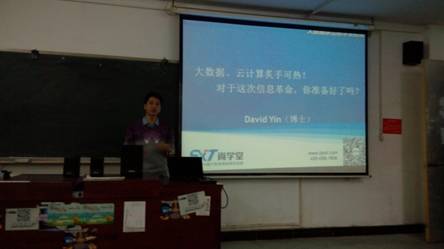 为更好地建设好我系新开的数学与应用数学专业大数据分析与应用方向,10月29日下午,我系特邀请尚学堂公司的尹洪博士与罗娉老师就大数据与云计算技术与我系老师在致远楼413办公室举行了交流座谈会,晚上在致远楼412教室为我系15级大数据班、15级信计班及部分13、14级信计班学生做了一个题为“信息革命——浅谈炙手可热的大数据、云计算”的学术报告。尹洪博士毕业于国防科技大学计算机学院,发表高水平学术论文30多篇,研究方向是大数据挖掘、云计算、网络安全。系美国加州伯克利大学的高级访问学者,广州超算中心天河二号项目的参与者。曾在微软亚洲研究院、腾讯微信大数据项目组以及北京总后科研所从事大数据相关工作。