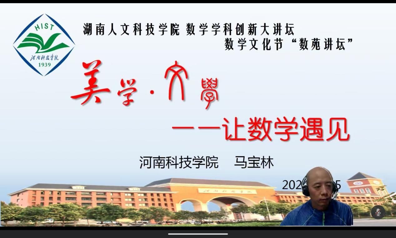 4月25日晚,河南科技学院数学科学学院党委副书记马宝林应邀通过腾讯会议平台开展以“美学·文学——让数学遇见”为主题的讲座,副院长龙志文主持,部分学生参加。