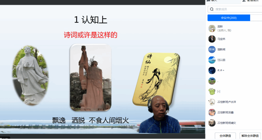 马宝林从一个花式自我介绍入手,通过对姓名旋转、平移、翻转带领大家初探数学之妙,通过拆分、重组、变形初品数学之根,并从“问渠那得清如许”“繁花犹须绿叶配”“接天莲叶无穷碧”“心有灵犀一点通”四个方面让大家在感悟数学与诗词碰撞、文化与美学相融的过程中体会数学之美、数学之妙。