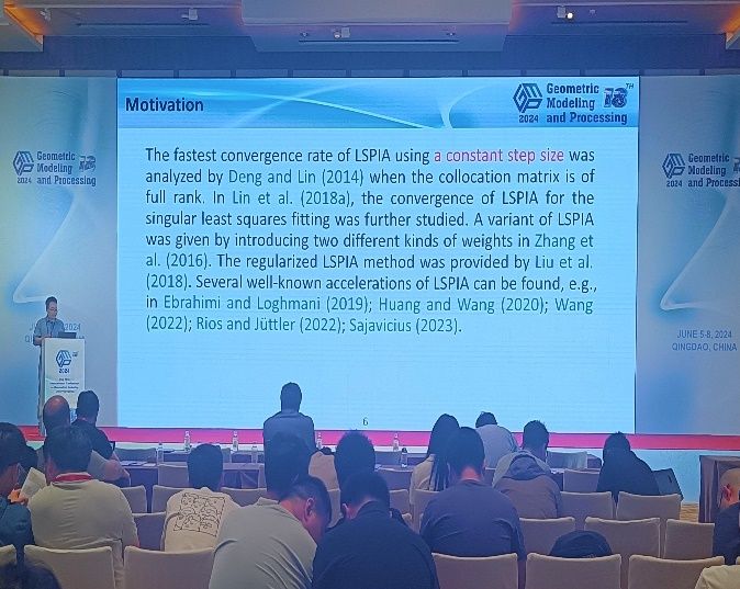 刘成志在会上连作两场题为《Asynchronous progressive iterative approximation method for least squares fitting》和《Two novel iterative approaches for improved LSPIA convergence》的学术报告。会议召开前,这两篇论文已被推荐发表在SCI源刊《Computer Aided Geometric Design》上,该期刊是中国数学会推荐的T1期刊以及中国计算机学会推荐的CCF-B类期刊。