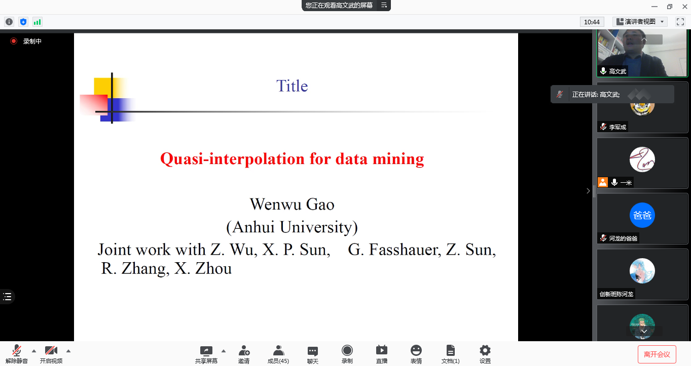 ,安徽大学统计学系博士生导师高文武教授应邀通过腾讯会议平台作了一场题为《Quasi-interpolation fordata mining》的学术报告。本次活动由学院“图形图像中的几何计算与优化”科技创新团队举办,团队成员刘成志博士主持,吸引了来自华南理工大学、中南民族大学、长沙理工大学以及贝博50余名师生参加。