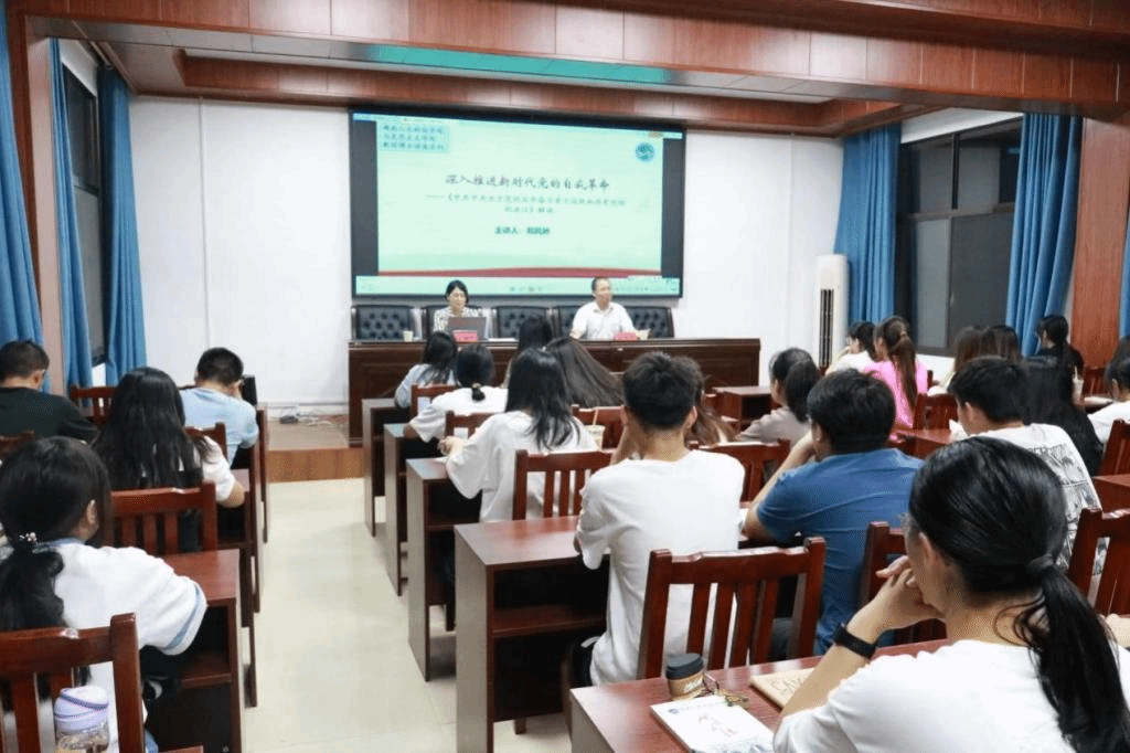 为深入学习贯彻党的十九届六中全会精神,推进思想政治教育一流本科专业建设,提高学生政治素养和专业水平,在学院领导的组织和安排下,9月27日晚,我院郑凤娇博士在若谷楼多功能报告厅面向全院学生做了一场题为“深入推进新时代党的自我革命——《中共中央关于党的百年奋斗重大成就和历史经验的决议》解读”的专题讲座。本次讲座由教工党支部书记卿孟军博士主持,部分思政专业学生代表参加。