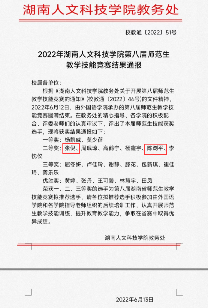 截止于6月12日,由外国语学院承办的第八届师范生教学技能竞赛已经圆满结束。凭借扎实的专业功底、巧妙的教学设计、娴熟的授课技能,我院19级思政一班张倪、20级思政二班陈浏平两位同学均获得评委认可,荣获校级二等奖。
