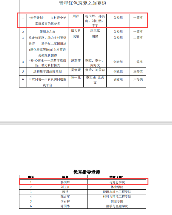 近日,从创新创业学院传来喜讯,由我院副院长杨国辉教授、孙淇庭等老师指导,19级思政1班周泽主持的《“麦芒计划”——乡村青少年素质教育的筑梦者》在学校第八届“互联网+”大学生创新创业大赛中,荣获“青年红色筑梦之旅赛道”公益组一等奖。我院副院长杨国辉教授获“优秀指导老师”称号。