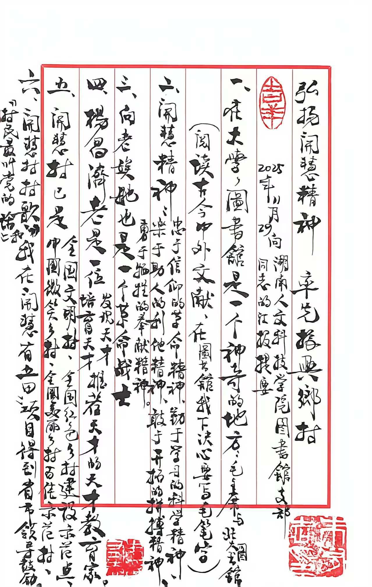 参观结束后,开慧村党支部第一书记朱有志作了题为《弘扬开慧精神,率先振兴乡村》的党课。生动讲述了革命领袖毛泽东主席与图书馆的不解之缘;讲述了开慧村总结提炼的关于开慧精神的五个内涵:忠于信仰的革命精神、勤于学习的科学精神、乐于助人的利他精神、敢于开拓的拼搏精神、勇于牺牲的奉献精神;讲述了教育家杨昌济先生的革命育人情怀;讲述了他以共产党人的情怀,16年如一日扎根开慧村这片红色土地,以党的农业现代化建设创新理念带领乡村振兴致富的经历。课后,朱有志书记为贝博图书馆捐赠了他的专著《开慧村语》系列图书。