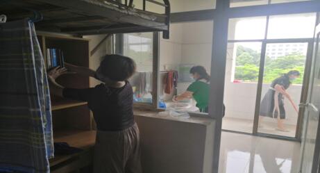 大家不怕脏、不怕累,整理桌子、床铺,擦洗洗漱台、阳台、地板,清理卫生间、垃极桶,认认真真的打扫着宿舍的每一个角落。经过大家的共同努力,十多间宿舍窗明几净,焕然一新。