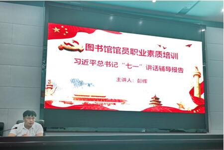图书馆党支部书记、馆长彭辉作了习近平总书记“七一”讲话精神宣讲的辅导报告。他带领馆员深入学习习近平总书记在庆祝中国共产党成立100周年大会上的重要讲话精神,深刻阐述重要讲话的核心要义和丰富内涵,鼓励大家从党的历史中汲取精神力量,强化使命担当,牢固树立为师生服务的思想,切实提高图书馆的服务质量。