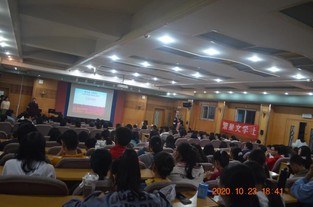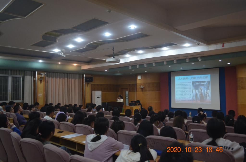 2020年10月23晚上7点,由贝博主办,图书馆承办,读者俱乐部、繁星文学社、DC漫社共同协办的第六届文学名著电影欣赏节活动在养根楼多媒体报告厅隆重拉开帷幕,图书馆刘辛田馆长、申彦舒副馆长、刘时容老师、汤道湘老师、教育学院点评嘉宾陈少辉老师,与来自全校的200余名学子一起共同欣赏了首场电影《安娜·卡列尼娜》。