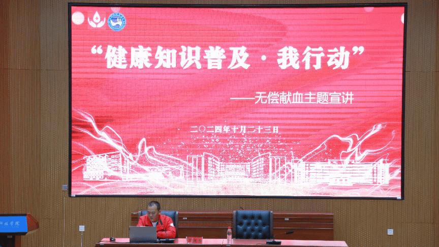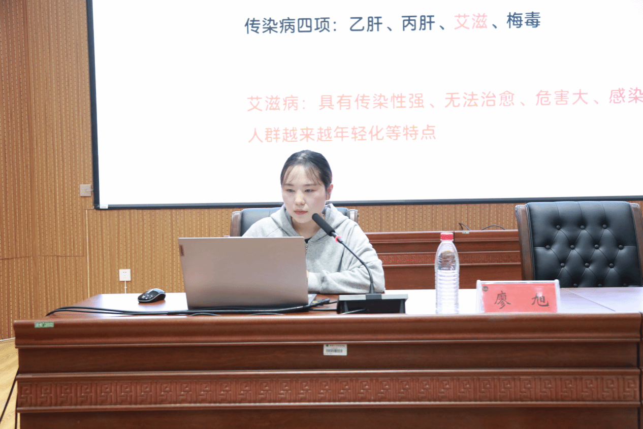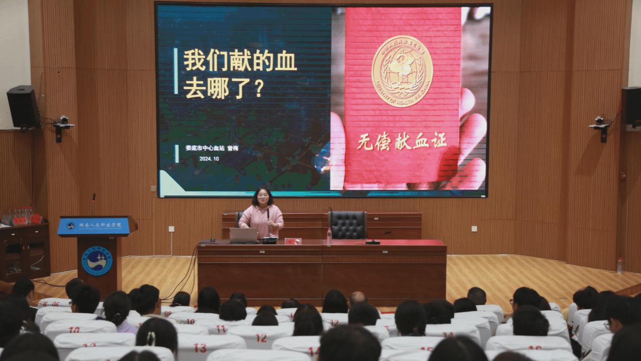 讲座伊始,娄底市中心血站质管科廖旭先生以“行动起来,向‘零’艾滋迈进”为题,通过图文并茂的解说和生动的实际案例,为在场师生带来了一场深刻的传染病防治知识宣教。廖旭的讲解深入浅出,使同学们对传染病尤其是艾滋病的预防与治疗有了更加全面和深入的了解。随后,娄底市中心血站采血科肖莎菲女士为大家带来了无偿献血基本知识宣讲。她从血液的构成、作用,到献血的基本条件、流程及注意事项等方面进行了详细阐述,条理清晰,言简意赅,为志愿者们深入开展献血工作奠定了坚实的理论基础。