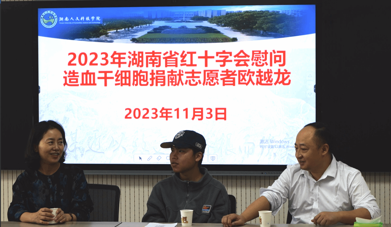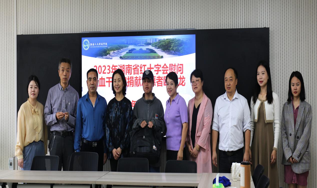 为大力弘扬红十字会“人道、博爱、奉献”的精神,11月3日上午,湖南省红十字会来贝博慰问造血干细胞捐献志愿者欧越龙同学。湖南省红十字会党组成员、副会长邱梦丹,湖南省造血干细胞捐献者资料库管理中心主任张赞、湖南省造血干细胞管理中心卓林悤,市红十字会党组成员、副会长李林华,市红十字会秘书长刘鸥,娄星区常务副会长严希、副会长熊艳,校友办主任刘莉、校团委副书记刘佳、美术与设计学院副书记成伟及有关师生代表参与本次慰问会。