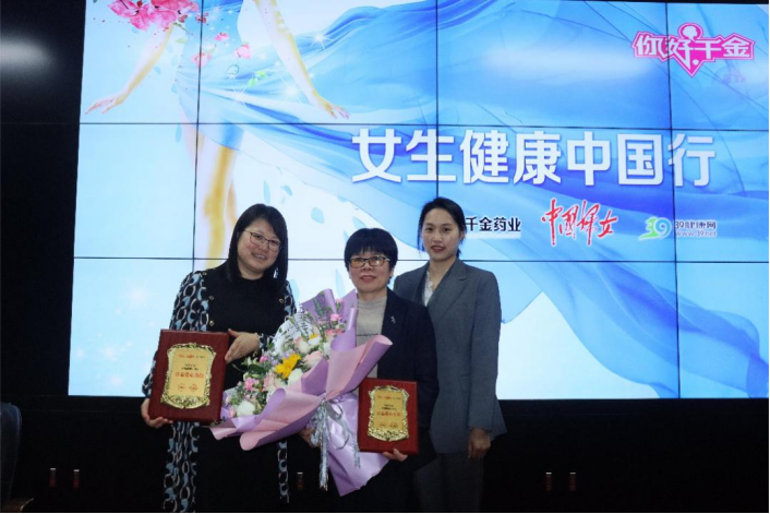 (图为校团委刘佳副书记与千金药业负责人和周任慧教授合影)