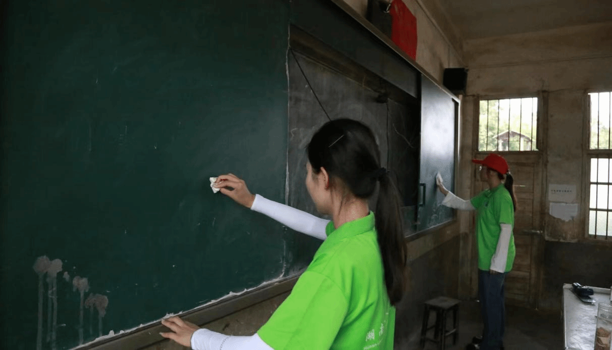 7月11日上午,志愿者前往灌溪小学,在带队老师的指导下,志愿者们一分为二,一组清扫室内环境,洒扫灰尘、清洁玻璃、擦黑板、整理讲台、课桌;另一组负责清理室外杂草,他们手持扫把、簸箕、垃圾桶、塑料袋等卫生工具,灌溪小学焕然一新。