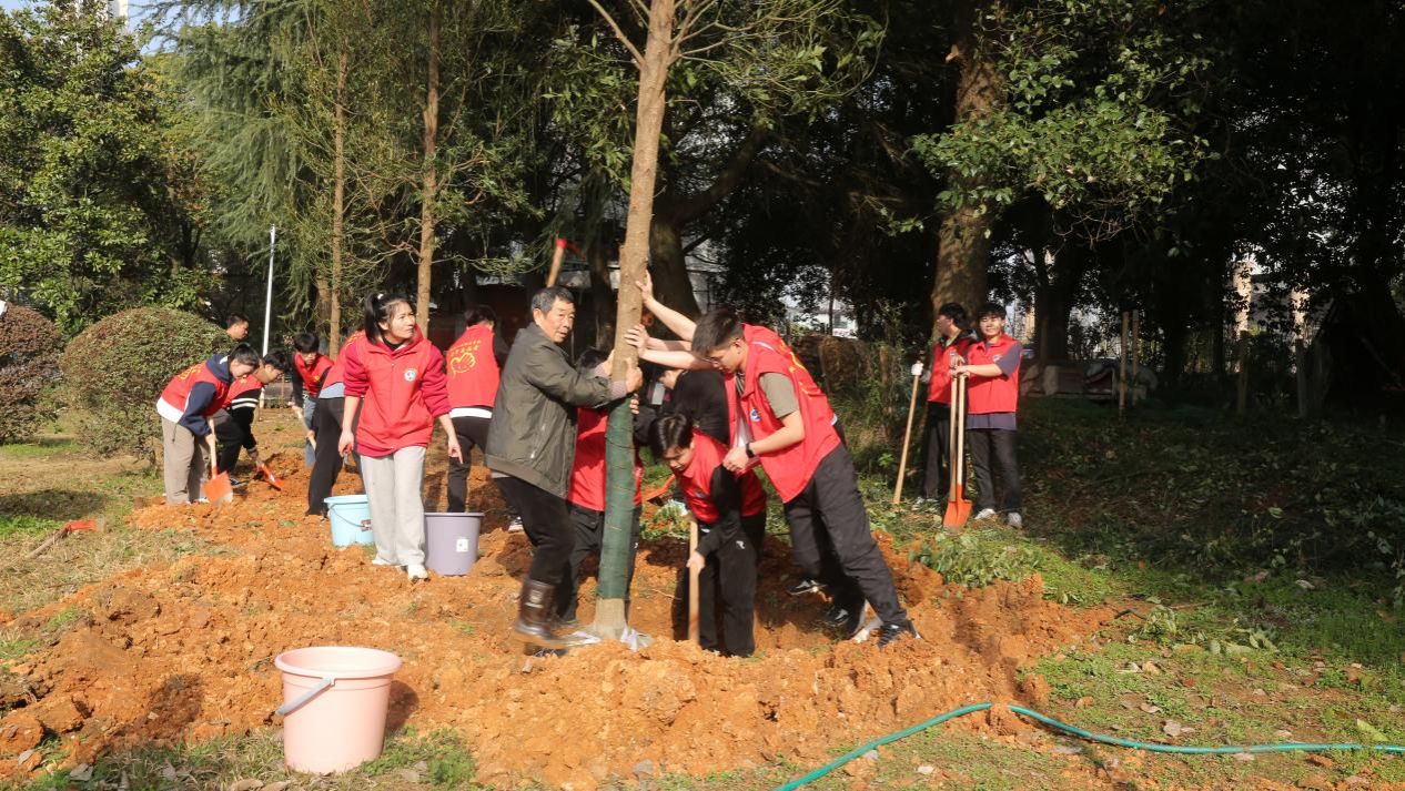 植树现场,校领导们和志愿者们或两人一组,或三人一队,扶树正苗、培土围堰、浇水定根,气氛热烈。每个环节衔接有序,配合默契,植树现场一片繁忙有序、干劲十足的景象。历经1小时的辛勤劳作,一株株金丝楠木、桃树错落有致,迎风挺立,焕发出无限生机与活力。