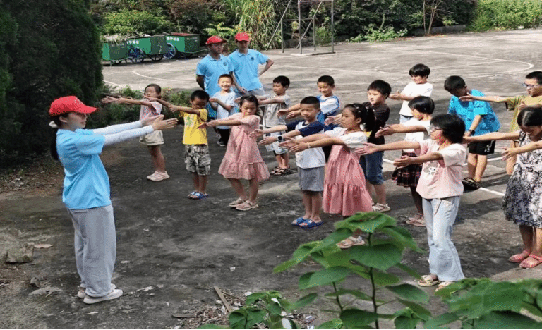 课堂上,支教老师带领小朋友们进行热身小游戏,在游戏中,孩子们笑声连连,欢呼声此起彼伏,整个校园洋溢着欢乐与温馨的氛围。
