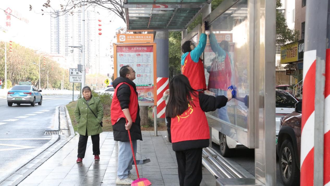 清晨,迎着朝阳一群“红马甲”相聚在校图书馆前坪,来自14个二级学院的60余名青年志愿者准备体验“雷锋”的一天。他们拿上清洁工具,分组行动来到氐星路、新星南路和学院路共5个公交站台擦亮了这座城市的“窗口”。现场,同学们分工协作,认真擦拭公交站台的玻璃、座椅,清扫周边地面垃圾,仔细清理卫生死角。他们用实际行动传承和践行雷锋精神,也以青春的活力和饱满的热情,引来无数路人驻足夸赞,这群印着ballbet贝博bb艾弗森名片的“红马甲”成为了今天娄底市区的一道亮丽风景线。