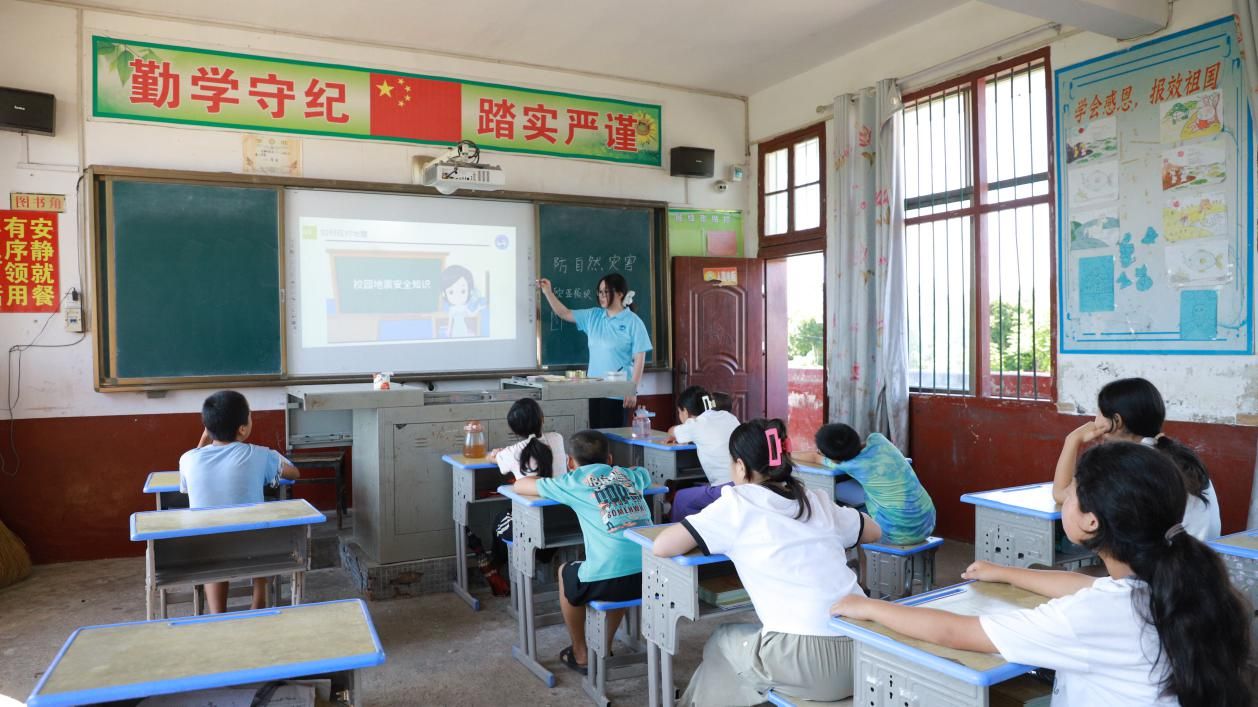 织密“防护网”,防灾于未然。在“防自然灾害”课堂上,志愿者为孩子们讲解了地震、洪水、极端天气等灾害的成因及自救措施,让他们掌握科学避险的方法。课堂还设置了问答环节,帮助孩子们巩固防灾知识,掌握实用的安全技能。