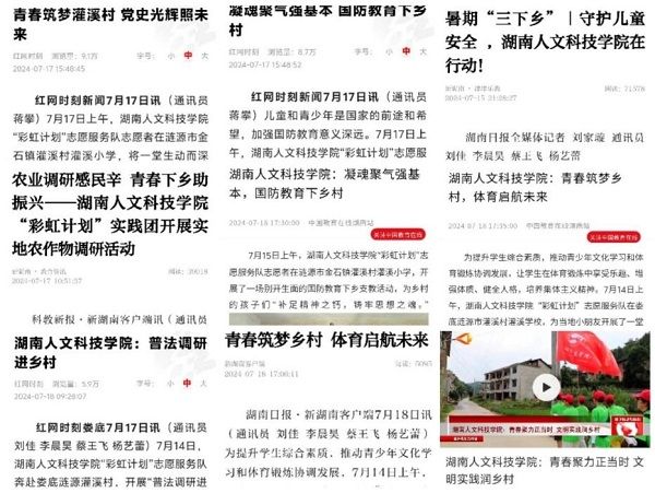 能机学院机械设计制造及其自动化专业的徐瑞杰、段瑞杰、刘方安,能源与动力工程专业的李果与其他二级学院的四十名同学组成“彩虹计划”志愿服务队,以助力乡村振兴、关爱乡村教育、提升村民安全意识为主题开展为期15天的支教、调研与志愿活动,被中国教育在线(湖南站)、红网、新湖南等省级媒体报道10余次。