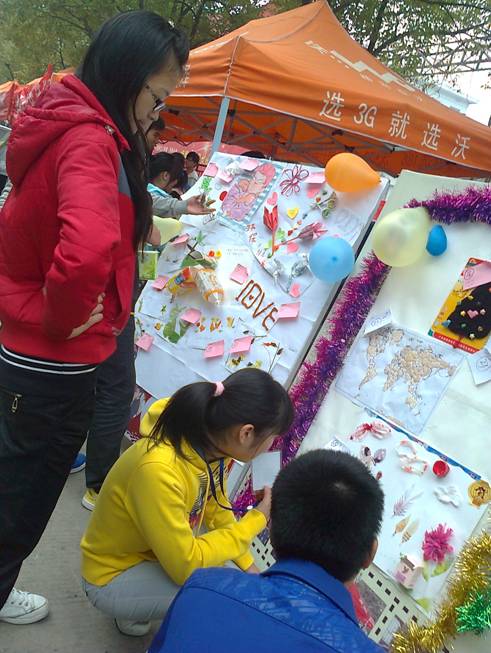 活动以互动交流的形式开展,现场气氛热烈。活动共分为作品评比、现场学艺、交流感言、发放奖品四个环节。活动伊始,这些精美的手工艺品迅速吸引了众多同学的眼球。现场观众跟工作人员一起动手用旧瓶子做起了“天使娃娃”,将活动推向了一个高潮。在“交流感言”展览板上,很多同学写下了自己对“环保DIY”活动的看法和心得。
