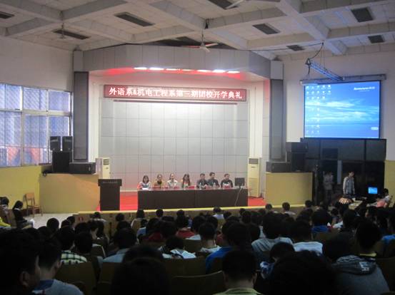 2013年10月27日,外语系与机电工程系在匠成楼报告厅举行了第三期团校开学典礼。校团委书记谢柳、机电工程系党总支书记谭甲凡、外语系党总支书记胡瑾、校团委副书记魏彦煜、机电工程系党总支副书记刘宗良、外语系党总支副书记刘莉等领导和老师出席,外语系团总支书记龙立平主持大会。